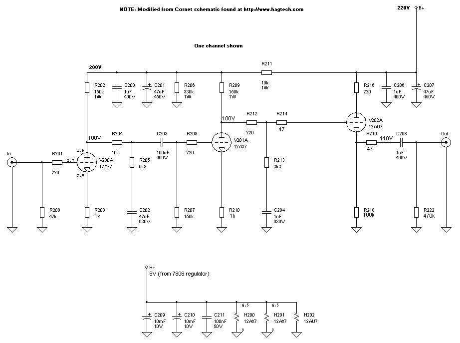 This is how my modified version looks: The two 5670WA to the left has been replaced by 2 12AX7 and a single 5670WA is used as output buffer.